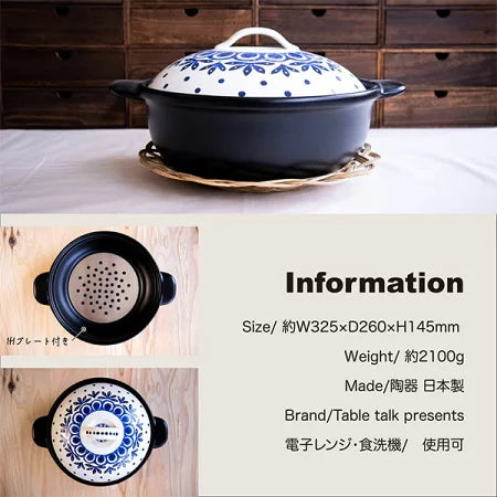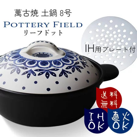 万古焼 IH 直火 土鍋 リーフドット 8号土鍋 (2~3人用) IH用プレート付 (イングレーズ) 〈7-2086〉 日本製 卓上鍋
