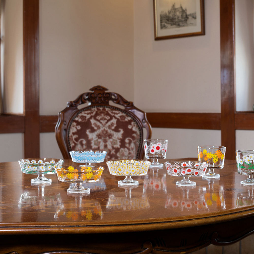 代表的な商品の一つは、花や動物など、かわいらしい柄をあしらったプリントグラスです。
