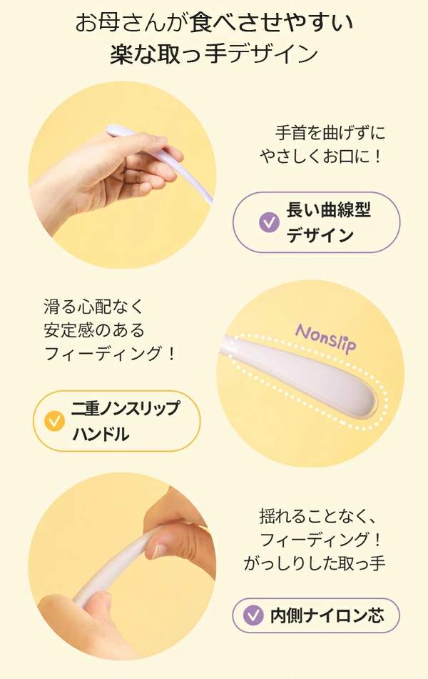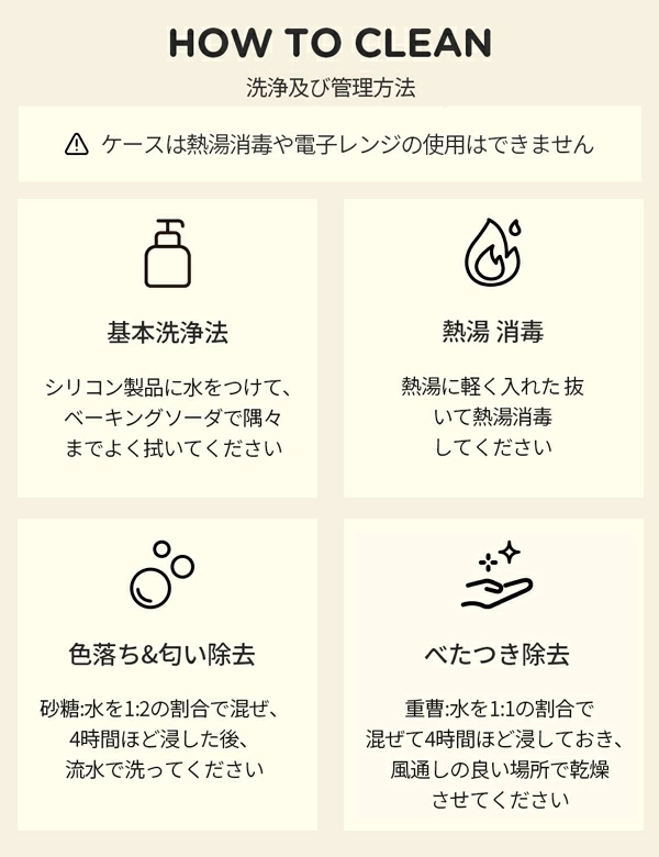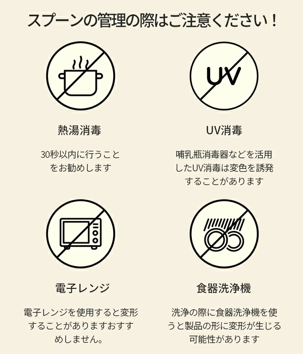イージーフィーディングスプーンは食洗機、電子レンジ、哺乳瓶消毒器不可、熱湯消毒は30秒以内(※イージーフィーディングスプーンのケースは熱湯消毒、電子レンジ不可)