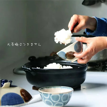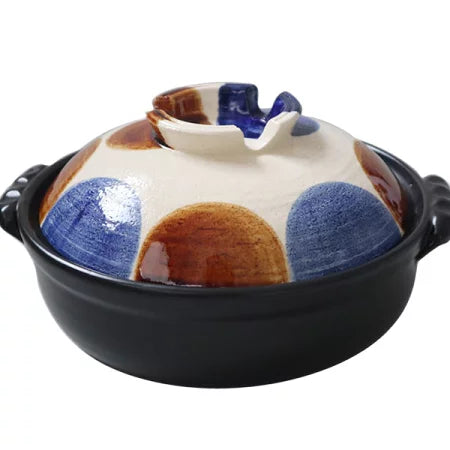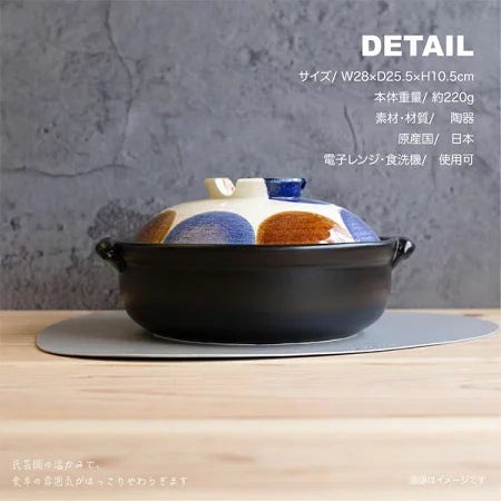 大きく描かれた点打の模様は、落ち着いた色合いであたたかな食卓を作ってくれます。土鍋の内側と蓋の内側にもしっかりと釉薬がかけられており、普段のお手入れもしやすい作りになっています。直火・IHコンロ使用可能です。