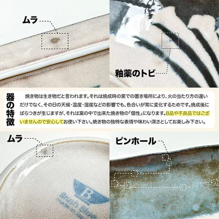 性質上、鉄粉、色ムラ、釉垂れ、ピンホール、小キズ、多少のゆがみが発生する場合がございますが、焼き物の特性であり、返品・交換対象の不良品ではございません。またご使用上の問題はございませんので、ご安心ください。