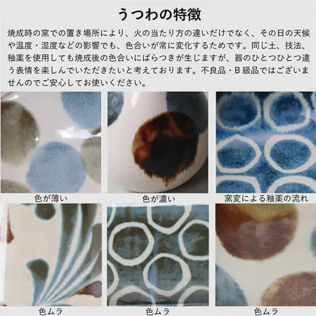 性質上、鉄粉、色ムラ、釉垂れ、ピンホール、小キズ、多少のゆがみが発生する場合がございますが、焼き物の特性であり、返品・交換対象の不良品ではございません。またご使用上の問題はございませんので、ご安心ください。
