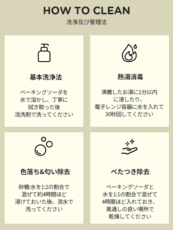イージーフィーディングスプーンは食洗機、電子レンジ、哺乳瓶消毒器不可、熱湯消毒は30秒以内(※イージーフィーディングスプーンのケースは熱湯消毒、電子レンジ不可)