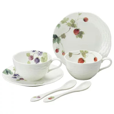 ルーシーガーデンシリーズの中でも特に人気の「ストロベリー」と「ブラックラズベリー」の絵柄をアソートにした、コーヒー紅茶どちらでもお使いいただけるカップ&ソーサーと同じ素材のスプーンのペアセットです。